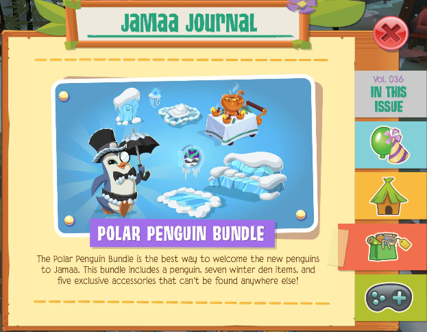 You can pick up the polar penguin bundle to get exclusive den items and accessories. The penguins are also welcomed to attend the penguins only party. I have yet to update the treasure hunt schedule on the penguin's part, so please be patient.